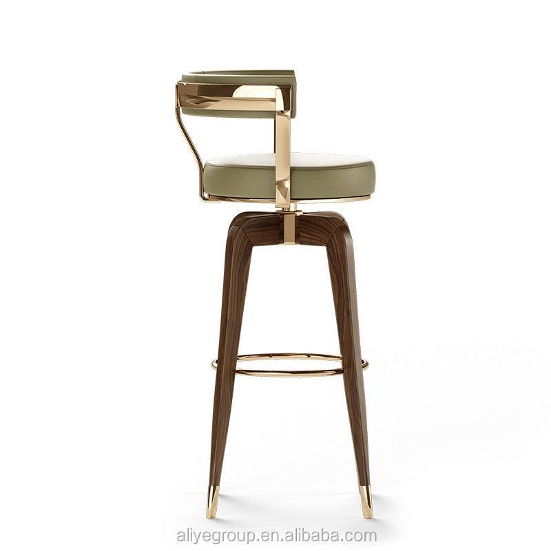 Sabini yağ yeşili suni deri dikiş detaylı ahşap ayaklı ceviz rengi cilalı pirinç detaylı bar sandalyesi